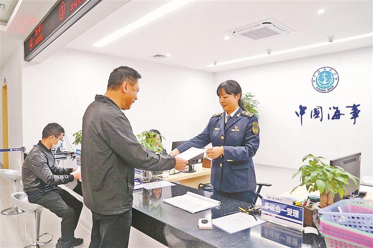 厦门海事局政务中心工作人员为船企发放船舶证书。(厦门海事局 供图)