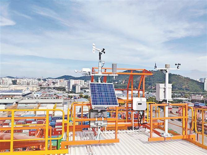 在海天码头10号桥吊机房的顶部,这套拥有太阳能光伏板以及一整套传感器的专业设备,已经高度融入码头前沿的生产环境。它昼夜不停运转,实时采集所在位置的能见度、风向、风速、温度、湿度、气压等气象要素并上传后台共享,将在强阵风、强降雨、浓雾等恶劣天气的应对方面发挥出显著作用。