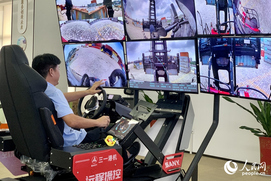 厦门国际航运科创中心内,技术人员正远程控制集装箱装卸作业。