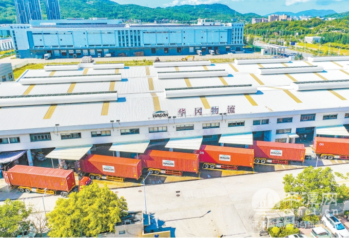 在岚台两岸跨境物流集散中心,货车在装卸货物。