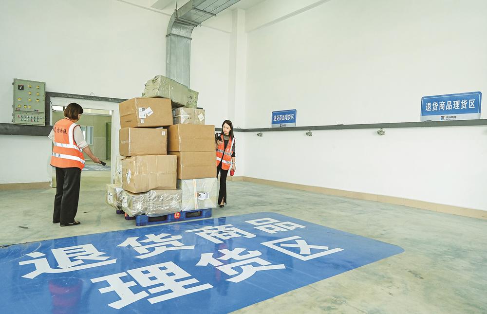 在岚台两岸跨境物流集散中心,货车正在装卸货物。