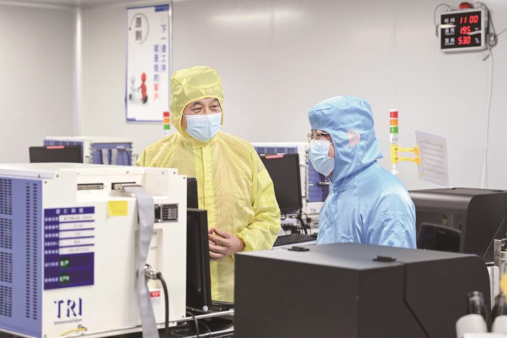 宗仁科技生产车间内,陈孟邦(左)正在忙碌。
