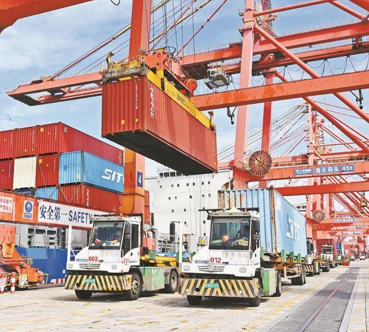 集装箱船舶一字排开,42台龙门吊、17台桥吊、近60辆拖车火力全开进行装船和卸货。1月28日上午,记者来到海天码头看到,现场一派繁忙。
