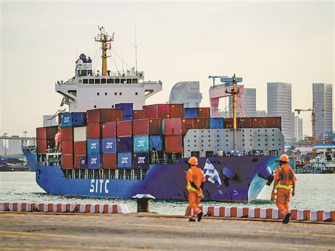 集装箱船舶昨日靠泊海天码头,运送海铁联运的汽车配件前往越南。