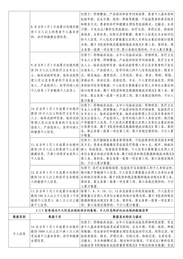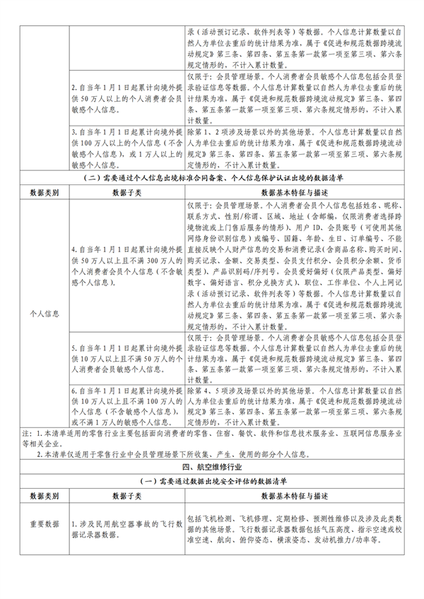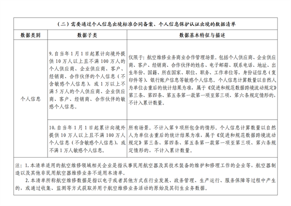 (二)需要通过个人信息出境标准合同备案、个人信息保护认证出境的数据清单,主要包括: